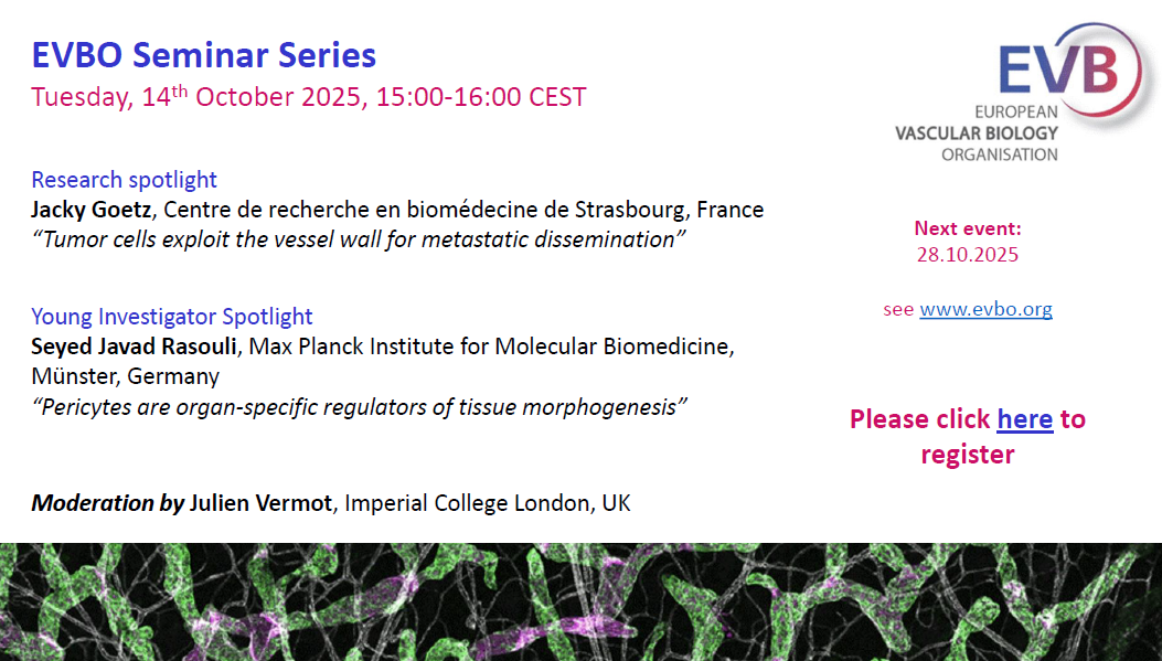 EVBO Seminar Series Tuesday, 14th October 2025 15:00-16:00 Central European Summer Time (GMT+02:00) Research spotlight Jacky Goetz, Centre de recherche en biomédecine de Strasbourg, France “Tumor cells exploit the vessel wall for metastatic dissemination” Young Investigator Spotlight Seyed Javad Rasouli, Max Planck Institute for Molecular Biomedicine, Münster, Germany “Pericytes are organ-specific regulators […] |